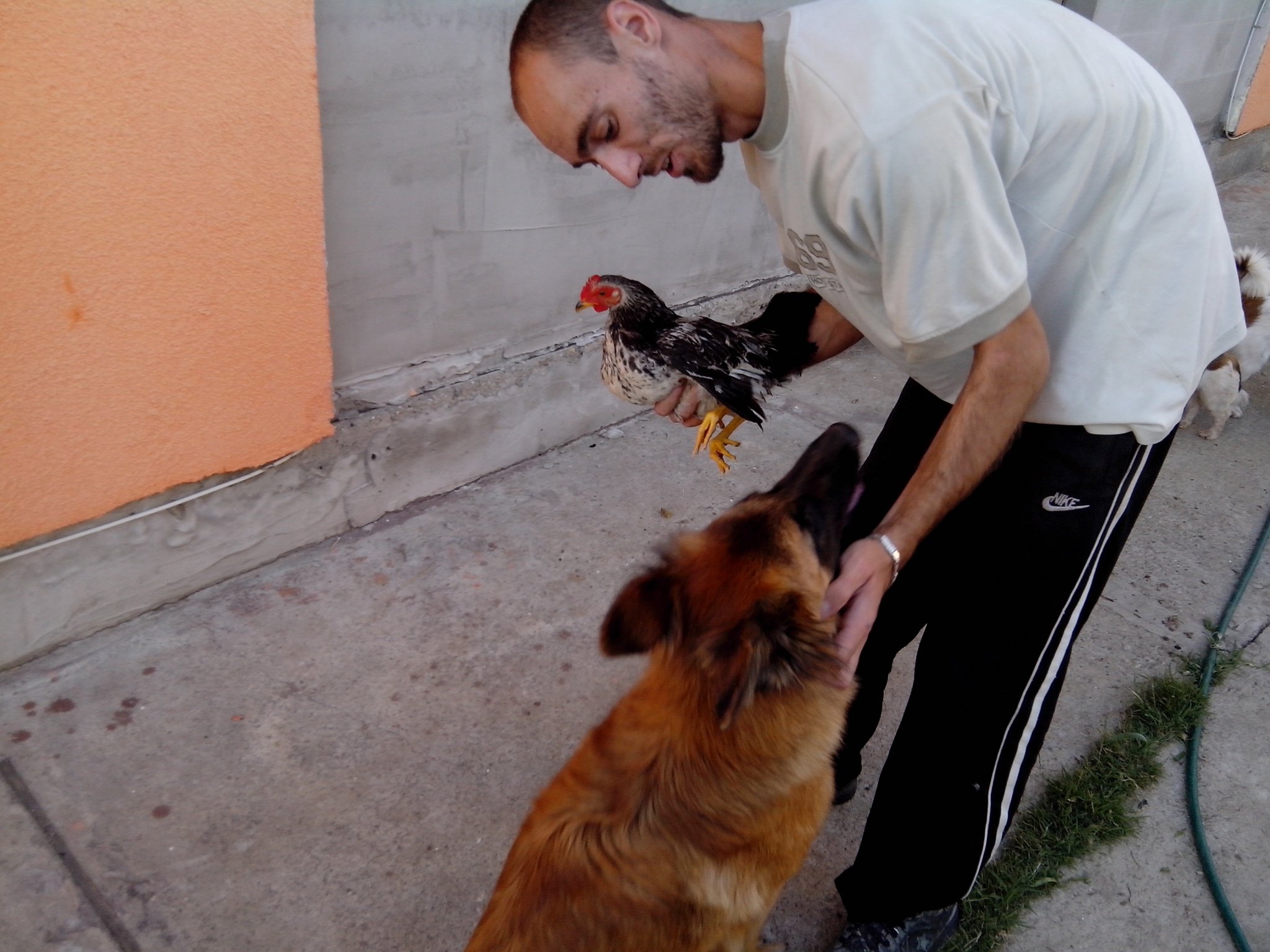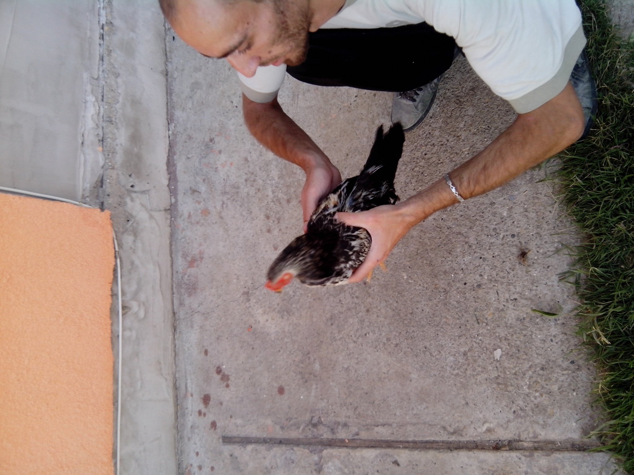 Ma a hím 2lábú ( apa ) bemutatott egymásnak minket a nyomi csirkével. Mikor kihozta a többiektől izgalmamban és éhségemben kicsit megtéptem szegényt, pedig már így is örülhet hogy a többi szárnyaspajtás nem bántja őt azért amilyen.